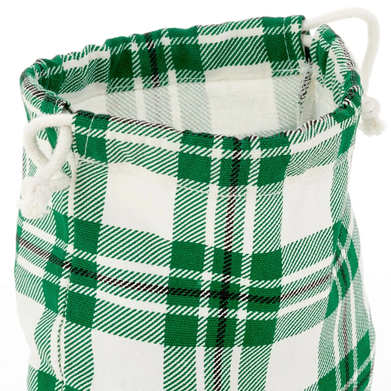 Celebrate Christmas in plaid style with this trio of colorful fabric holiday gift bags. Drawstring bags feature charming homespun plaid designs in blue, green and red. Each canvas bag features its own unique color so they’re perfect for giving singly—or sharing all three at once for a coordinated look. Hallmark medium-sized bags hold presents like small stuffed animals, video games, DVDs, books, candles and more.