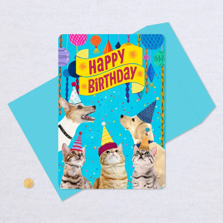 Cute kitty cats and puppy dogs dressed in b-day party hats deliver big happy birthday wishes that can’t be missed! Giant 11×16 birthday card offers plenty of space for the whole group to add their own birthday shout-outs. Glossy accents and pom-pom attachments add a fun touch. Great for coworkers’ celebrations, kids’ birthday parties, milestone birthdays and more.