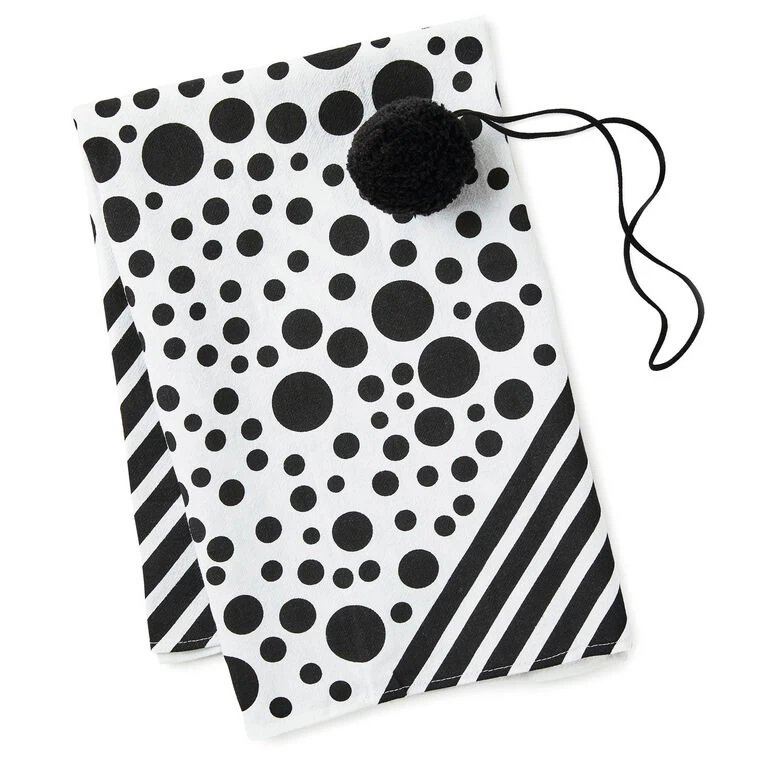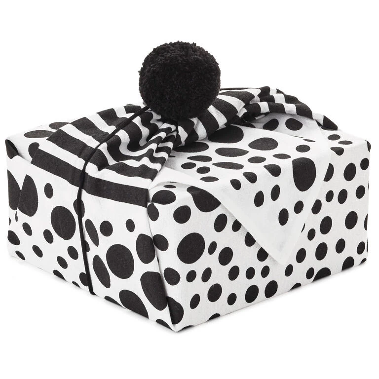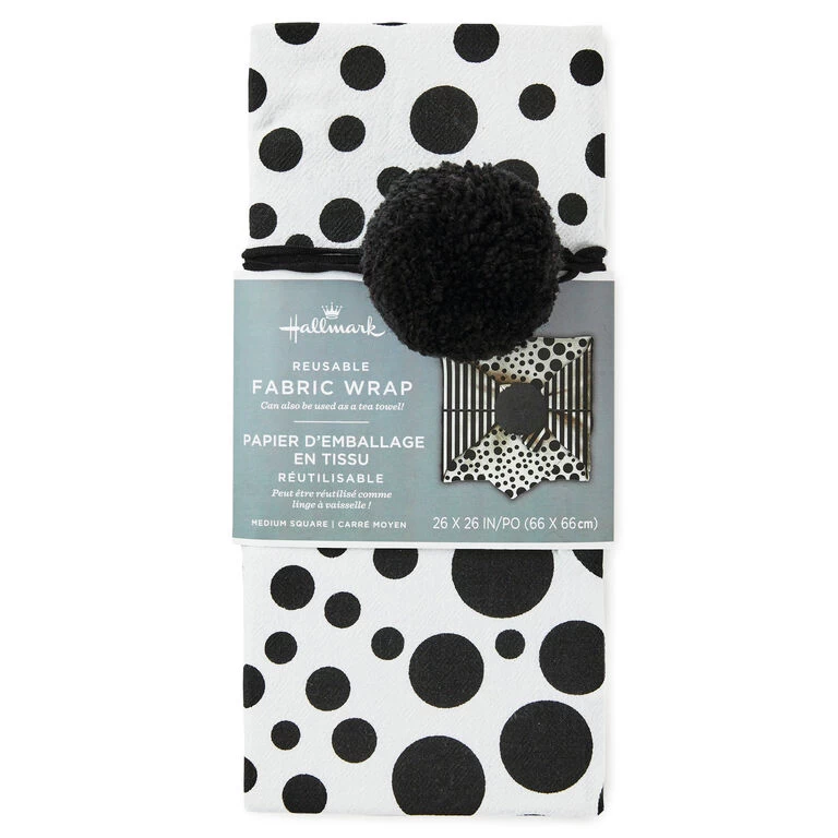 Wrap a gift in mod style with this reusable wrapping cloth in black and white. Inspired by traditional Japanese furoshiki wrapping squares, this cloth gift wrap features stripes and polka dots and makes a great way to present a small gift to a friend or family member. The included black pom-pom gift bow features a stretchy elastic band so you can secure the fabric around your gift with no tape or pins required. Hallmark fabric gift wrap is perfect to have on hand for all gift-wrapping occasions.