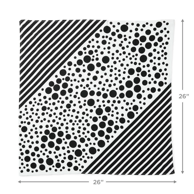 - Square cotton fabric gift wrap features black dots and stripes on a white background.