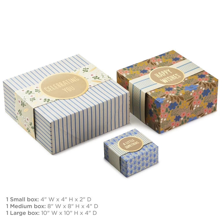 - Pack of 3 gift boxes include belly bands with gold foil accents.