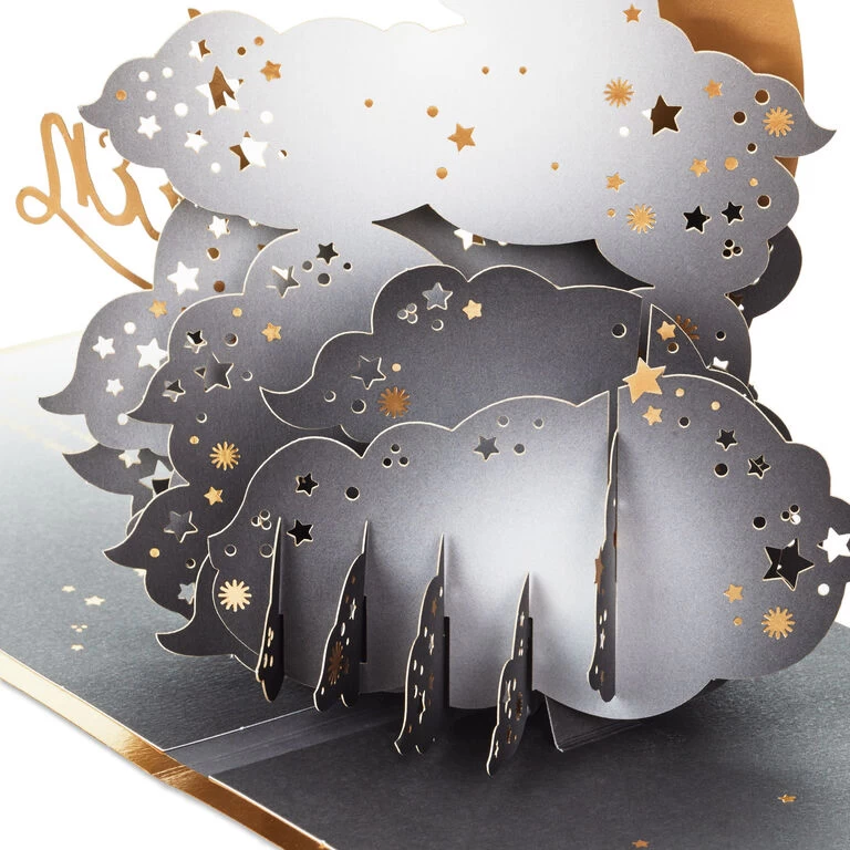 Pop-up Halloween greeting card features a crescent moon and stars with gold foil accents paired with Halloween wishes and gold foil border on the front. Simply open the card to reveal the 3D pop-up surprise inside—no assembly required: an intricate, laser-cut scene of a smiling crescent moon in the night sky along with clouds, stars and bats pops out. Gold foil accents add a shiny touch to the inside of the card. This Halloween card crafted from premium card stock is a work of art sure to be displayed all season long, making it an unforgettable way to share happy Halloween wishes with friends and family members. When open, card lays flat for display; 3D pop-up inside measures approx. 5.75″ H.
