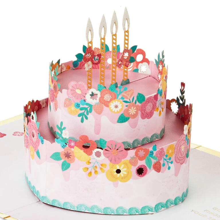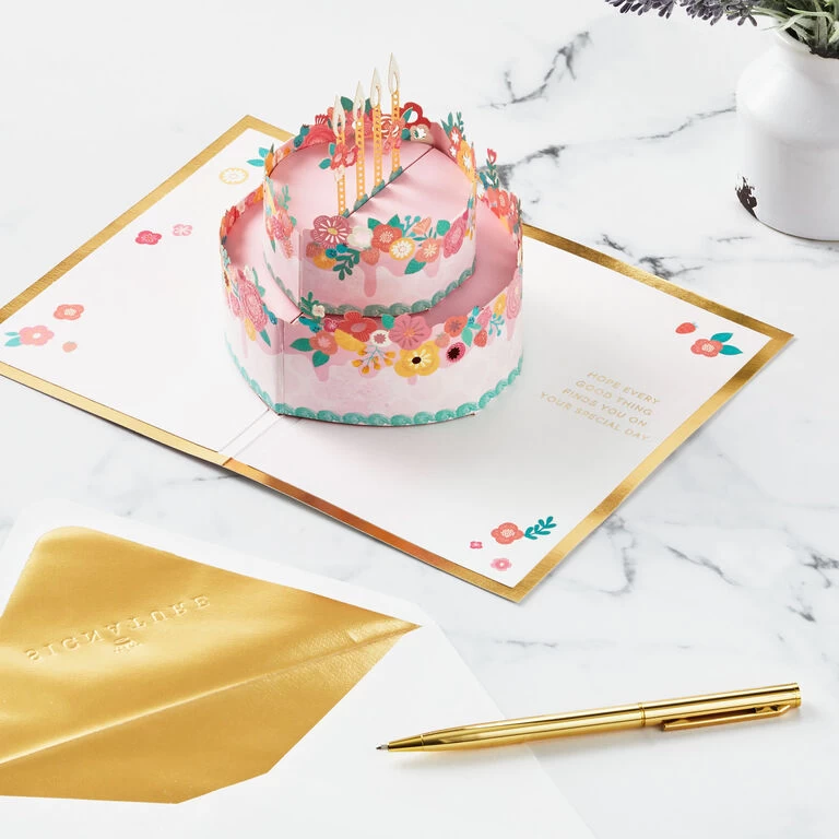 Pop-up birthday greeting card features a pretty floral design on a pink background with a gold foil border and a “Happy Birthday” message on the front. Simply open the card to reveal the 3D pop-up surprise inside—no assembly required: a pink tiered cake topped with colorful flowers and candles pops out. Gold foil accents add sweet finishing touches to the inside of the card. This fun greeting crafted from premium card stock is a work of art sure to be displayed all year long, making it an unforgettable way to share happy birthday wishes with friends and family. When open, card lays flat for display; 3D pop-up inside measures approx. 4.5″ H.