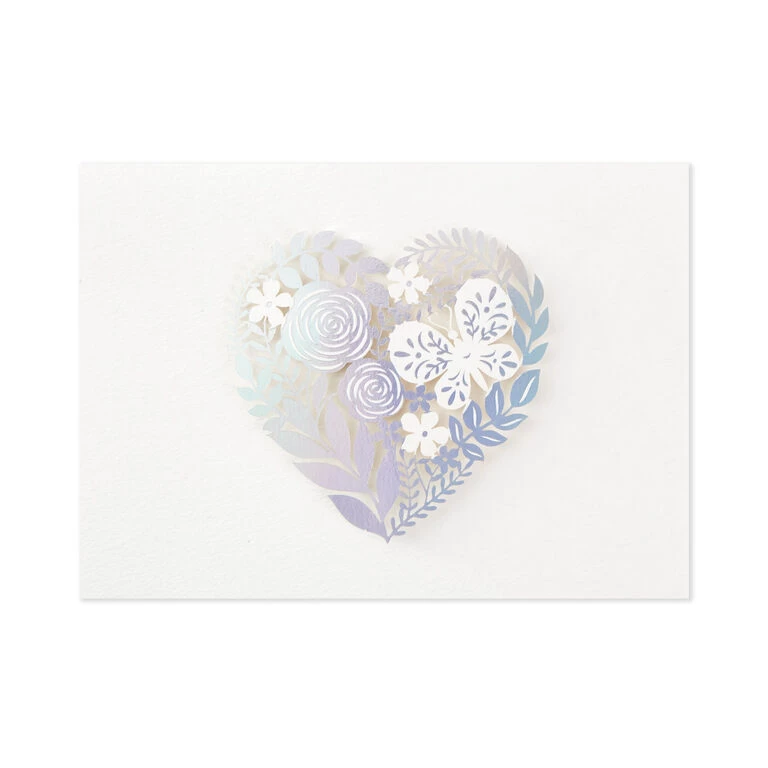 - Box of 8 blank note cards/foil-lined envelopes. Folded note cards feature a laser-cut floral heart design with iridescent silver foil accents.