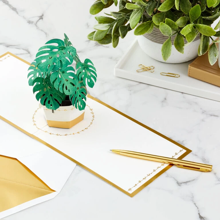 Pop-up thinking of you greeting card features a Monstera plant in a pot with gold foil accents and border on the front. Simply open the card to reveal the 3D pop-up surprise inside—no assembly required: an intricate, laser-cut scene featuring a potted Monstera plant pops out. Gold foil accents add a shiny and shimmery touch to the inside of the card. This thoughtful greeting crafted from premium card stock is a work of art sure to be displayed, making it an unforgettable way to share a thinking of you message with someone special. When open, card lays flat for display; 3D pop-up inside measures approx. 5.25″ H.