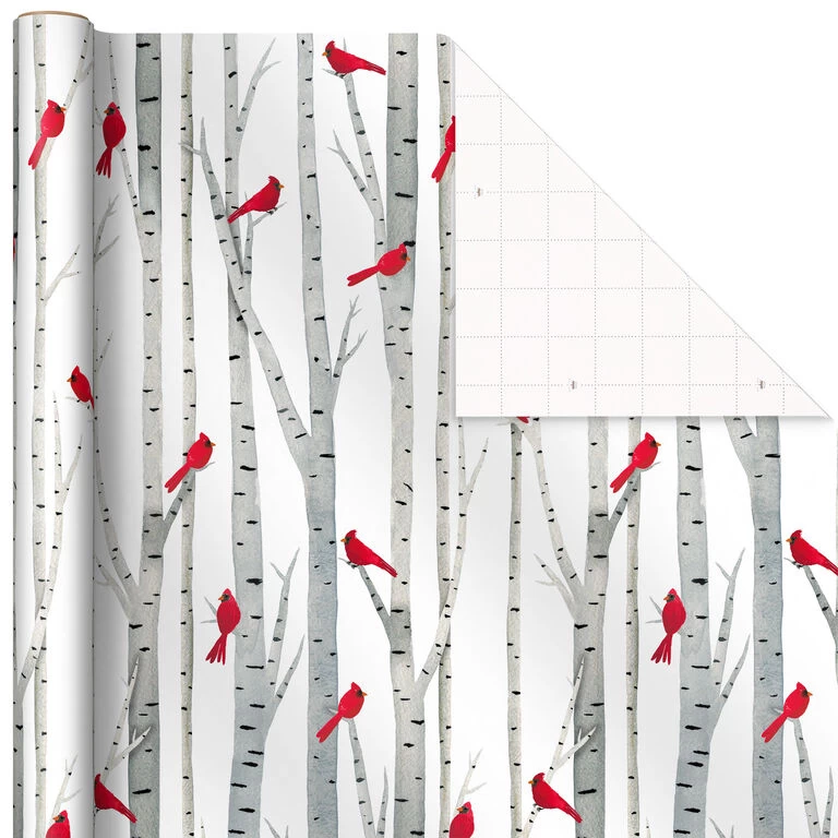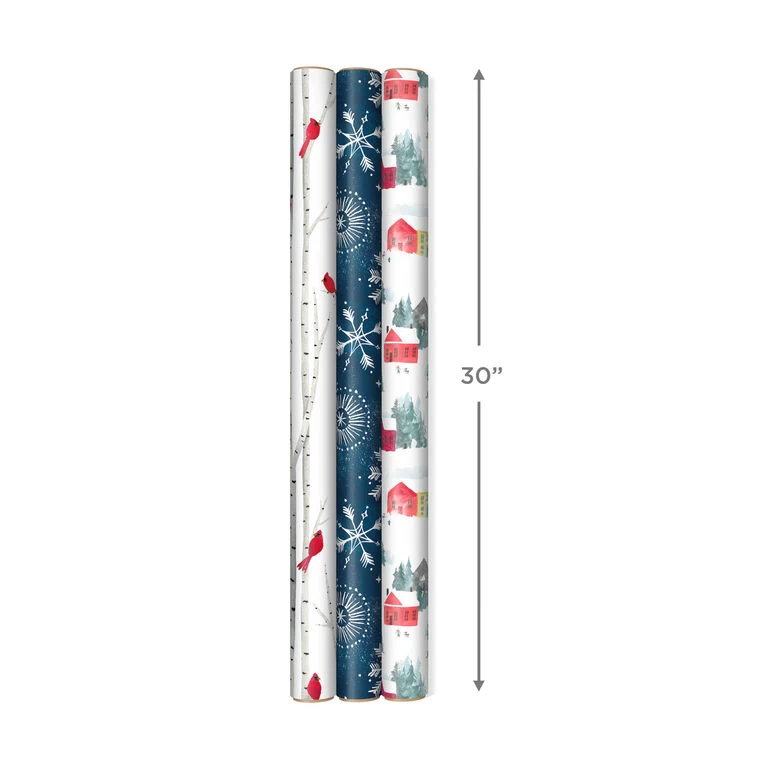 - Pack includes 3 wrapping paper rolls in assorted outdoor winter designs: cardinals on birch trees, illustrated snowflakes on navy and snowy village scenes.